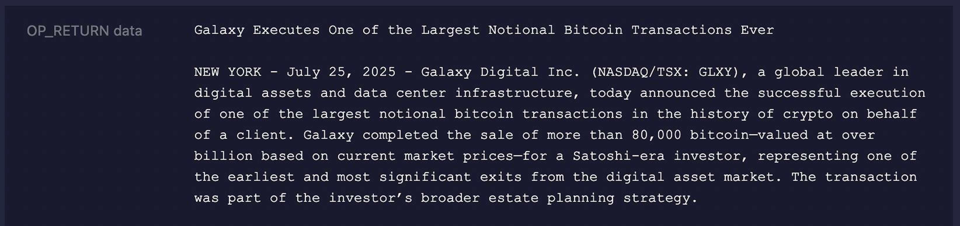 Galaxy Digital helped this client complete the sale of these coins, and then issued a press release via an OP_RETURN output. They also appear to have dusted 1-sat UTXOs to the original addresses at the clients request, perhaps sending a clear ‘middle finger’ to the party who was trying to take ownership of the coins under that strange veil of a ‘legal process’.