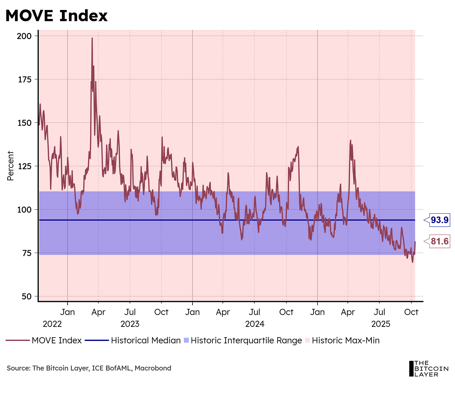 The only reason participants would be willing to borrow against borrowed collateral (rehypothecation) is that the collateral is extremely stable. In comes the MOVE Index. Bond market volatility affects the collateral multiplier directly, and therefore risk assets like bitcoin, because when it rises (MOVE Index up), you get two things: