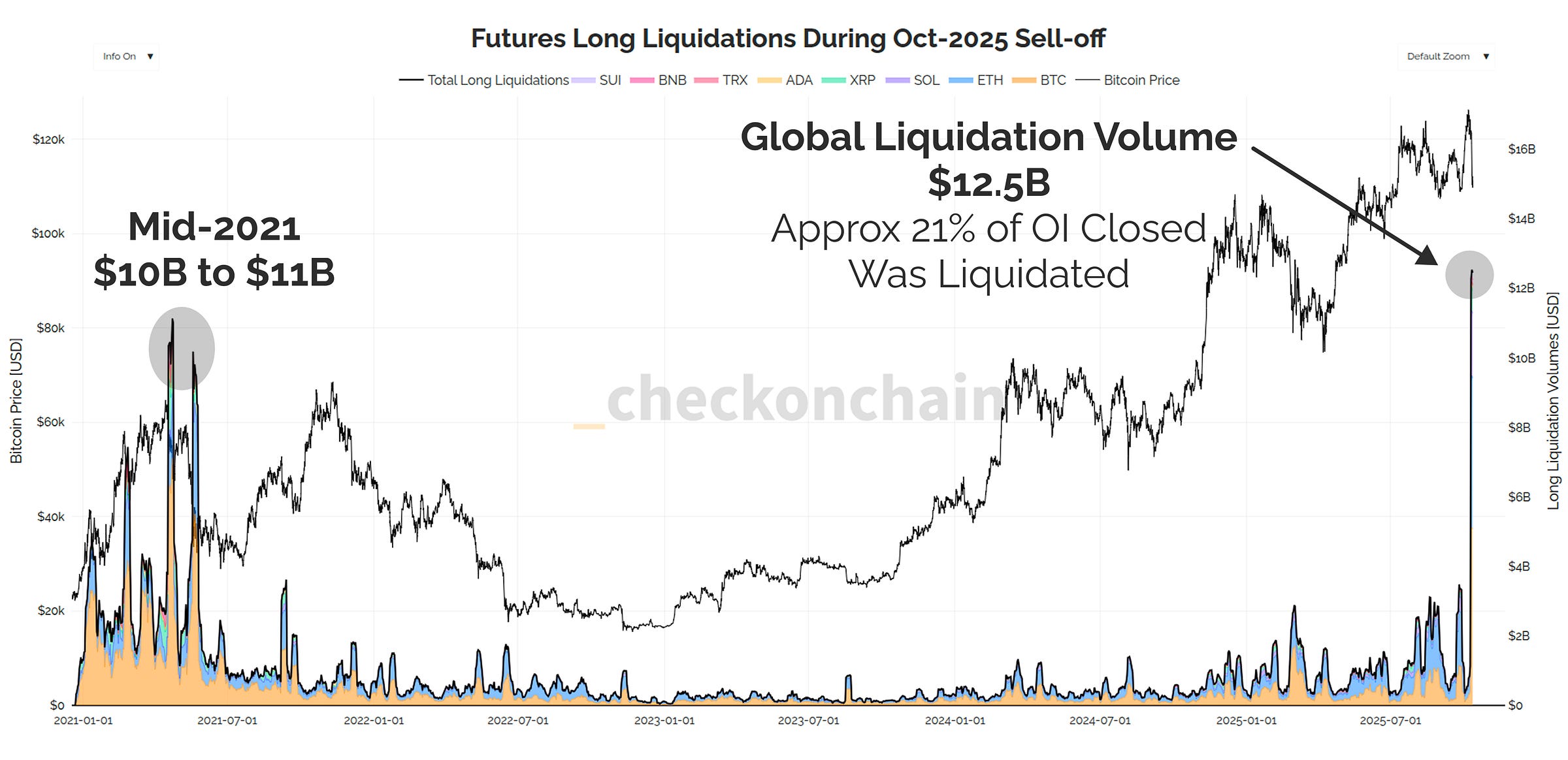Over $12.5B in liquidation volume occurred across the largest crypto-assets, representing around 21% of the total OI decline (the rest was from stop-losses and traders manually closing out their position, which didn’t zero their entire account).