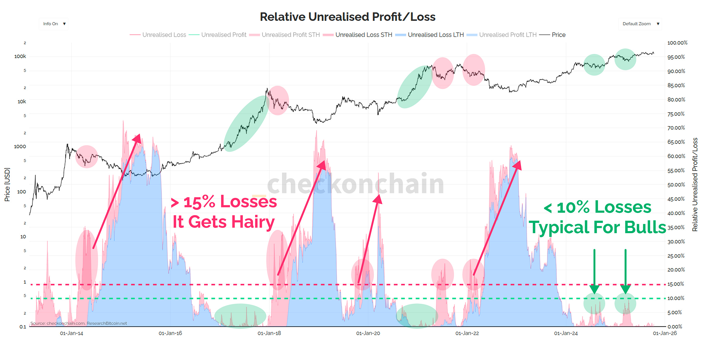 Bull markets of the past have tended to meet their end whenever unrealised losses spike above 10% of the market cap, and we touched that upper bound in both 2024 and 2025. If you can recall, those events also had people calling for the end of the cycle, and the start of a bear market.