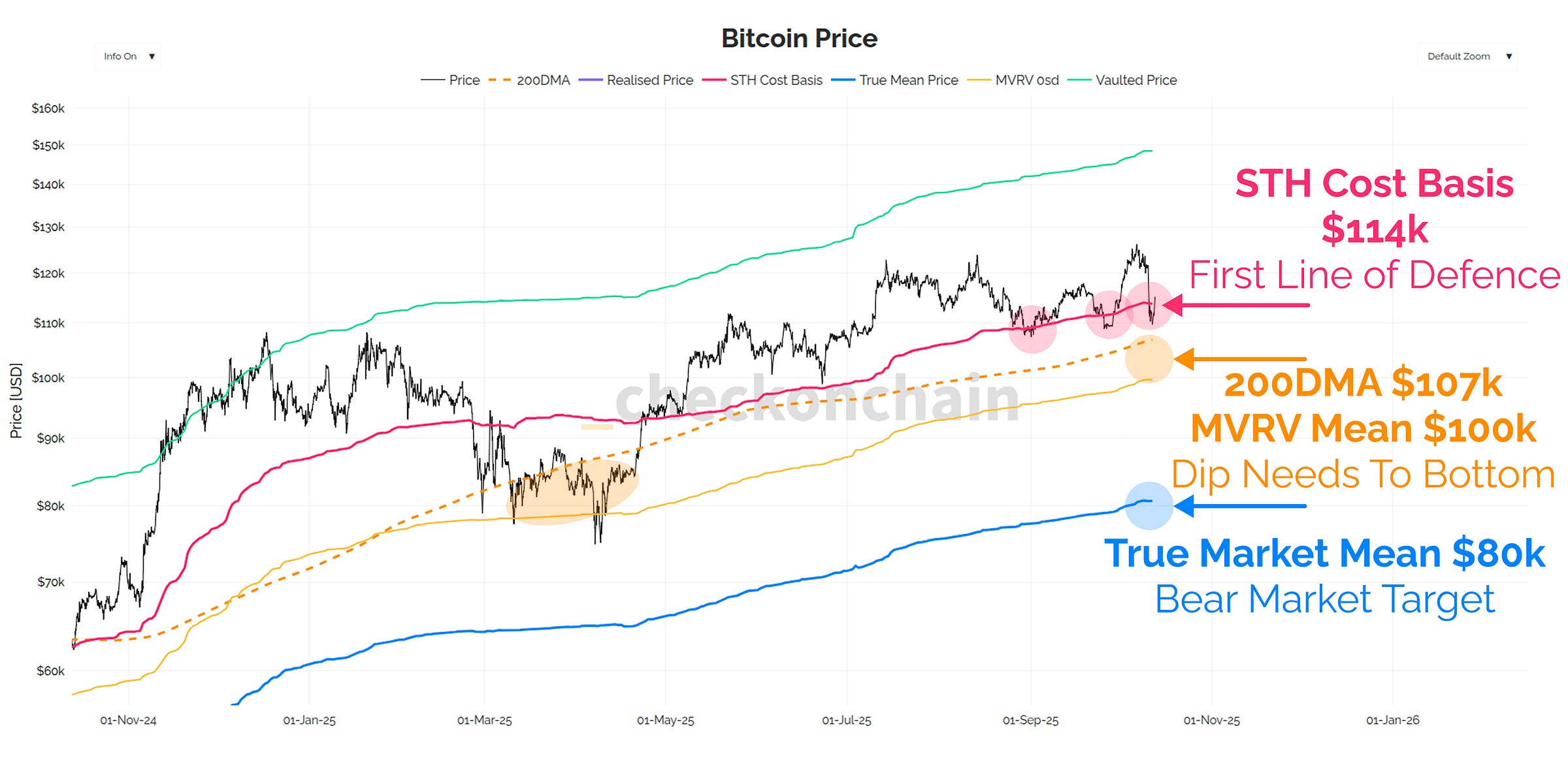 🟠 The 200DMA ($106k) and long term average of MVRV ($100k) are levels coincident with the deepest dips we have had so far in this cycle. As we will see in a moment, below $105k, we start to get a majority of holders underwater, and things get increasingly hairy below there.