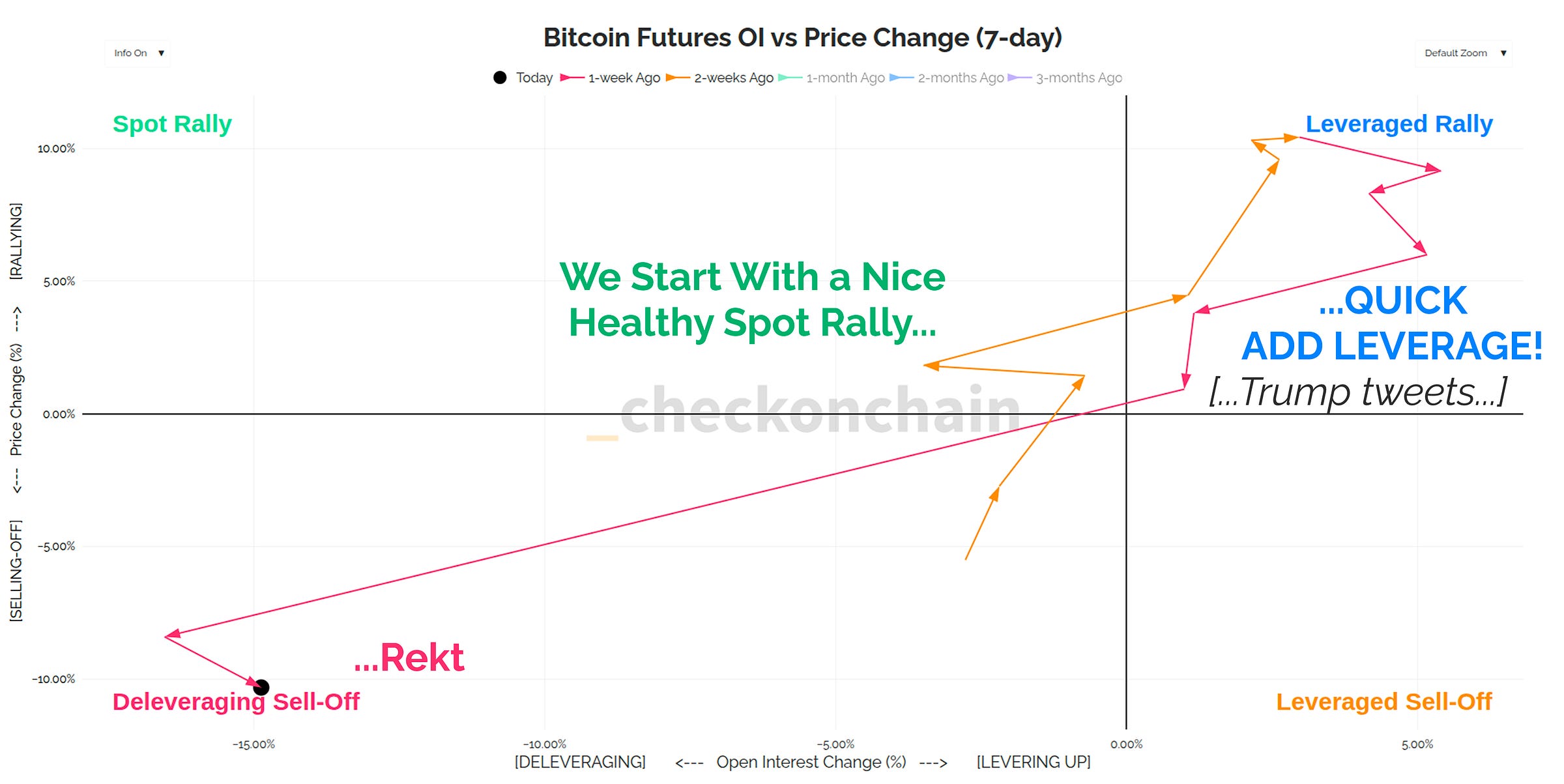 On the X-axis is the 7-day percent change in futures open interest, with the RHS indicating the market is levering up, and the LHS signalling a deleveraging.