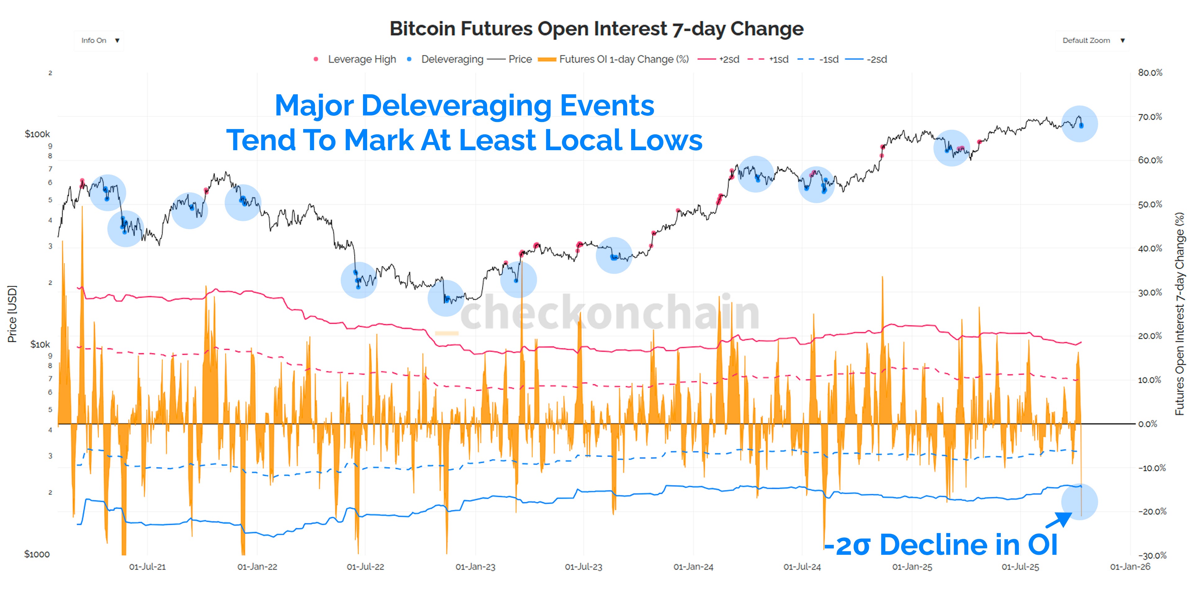 When we look at the open interest decline for Bitcoin specifically, this was a -2σ standard deviation decline, and the largest since the Yen-carry-trade unwind in August 2024.