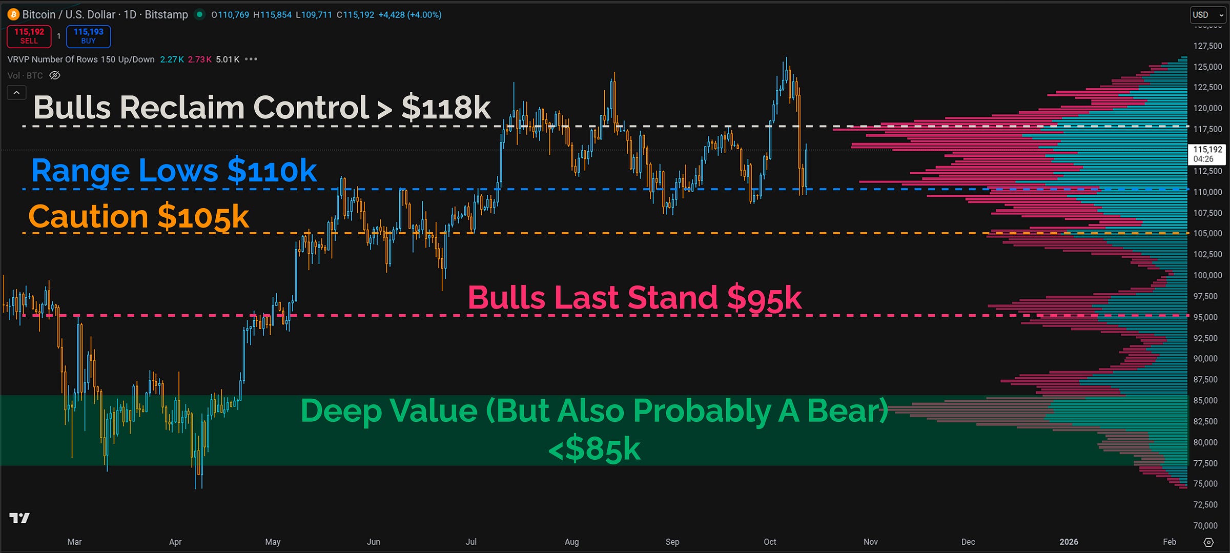 If the price gets down as far as $105k or even $100k, we really do need the bulls to step in. This is the mid-point of the range, and the last major volume node before $95k. The 200DMA is there, and we have bottomed out at this equivalent level in both 2024 and 2025.