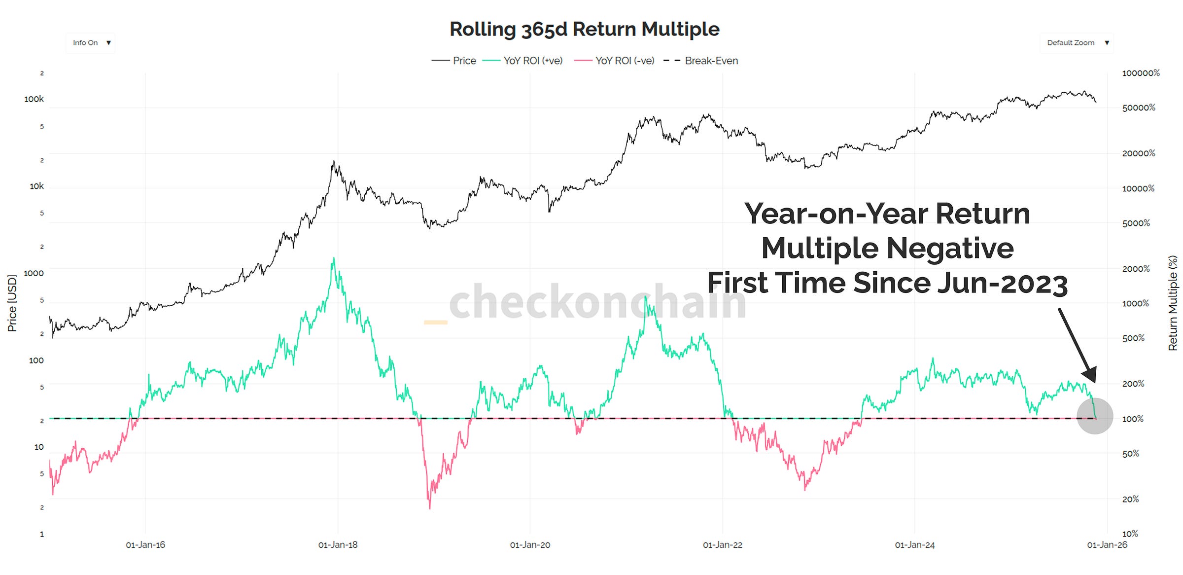 For the first time since June 2023, the year-on-year return for Bitcoin is negative, and as we’re trading at $86.5k, the price is now down -7% in 2025 YTD.