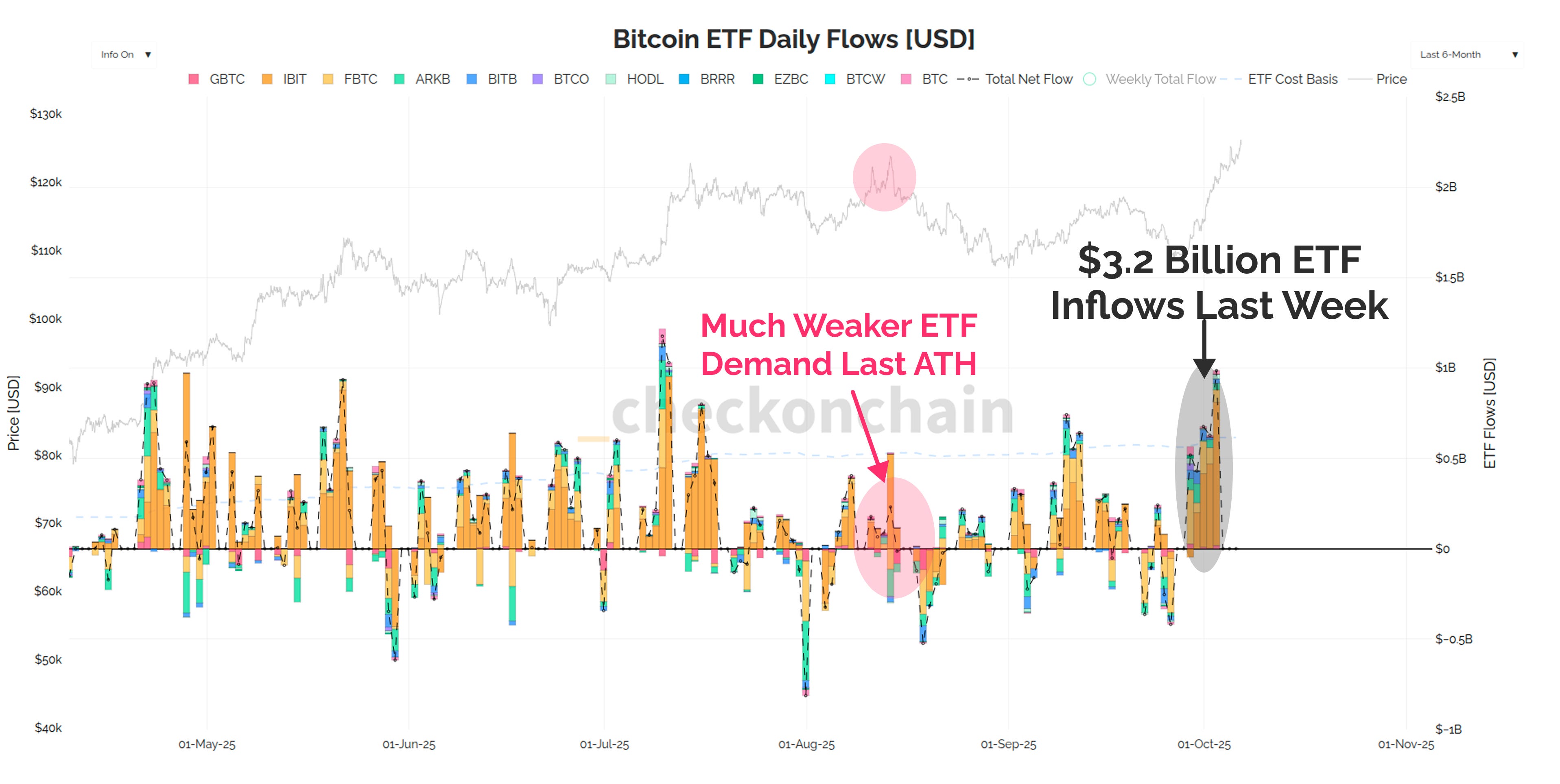 Bitcoin tags a new ATH of $125.8k, supported by a massive influx of spot and ETF demand. The price is now above the largest IBIT options call wall, and a lot of options sellers are now on the hook.