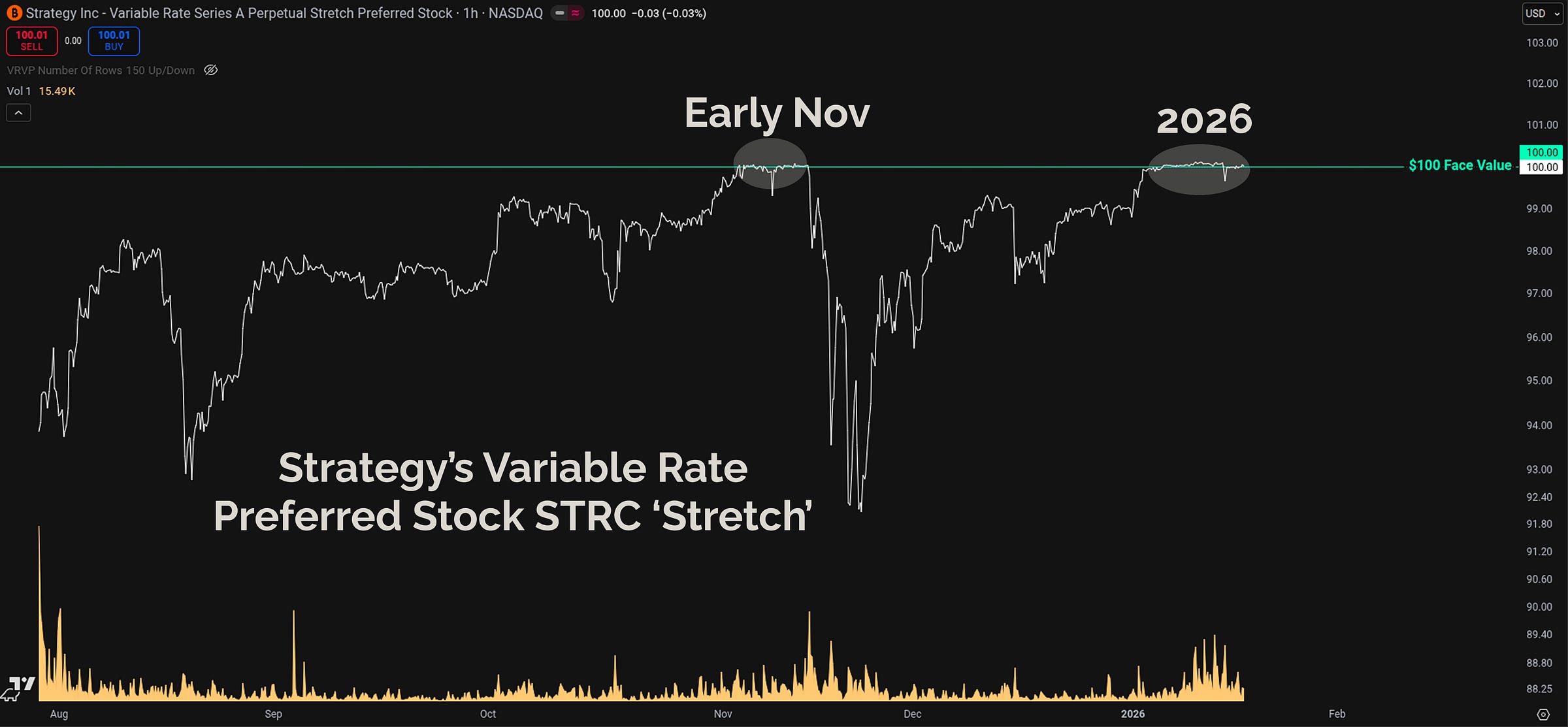 Strategy’s preferred stock STRC ‘Stretch’ reached the target $100 face value for the second time to date. The notable difference compared to November is that it has so far stayed there, even after a declared dividend date.